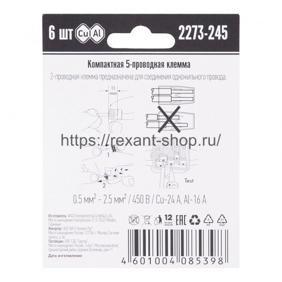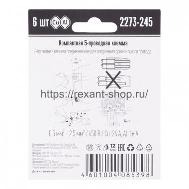 Купить по низким ценам Rexant 07-5144-06 Описание Rexant 07-5144-06 Элетромонтажные экспресс-клемы WAGO 2273-245 позволят безопасно и быстро соединить 5 проводов между собой (алюминиевые и медные как одножильные, так и многожильные). Достаточно просто вставить жилу кабеля или провода в клемму и самозажимной контакт надежно зафиксирует соединение. Диаметр соединяемых проводов должен составлять в сечении от 0,5 до 2,5 мм2. Номинальный ток 24А; Номинальное напряжение 450В. Удобные тестовые гнезда, прозрачный корпус для визуального контроля и смотровое окно для проверки защиты от касаний делают работу более безопасной. Наличие пасты обеспечивает надёжную изоляцию контакта