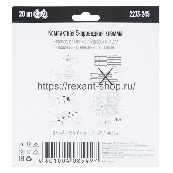 Купить по низким ценам Rexant 07-5144-20 Описание Rexant 07-5144-20 Элетромонтажные экспресс-клемы WAGO 2273-245 позволят безопасно и быстро соединить 5 проводов между собой (алюминиевые и медные как одножильные, так и многожильные). Достаточно просто вставить жилу кабеля или провода в клемму и самозажимной контакт надежно зафиксирует соединение. Диаметр соединяемых проводов должен составлять в сечении от 0,5 до 2,5 мм2. Номинальный ток 24А; Номинальное напряжение 450В. Удобные тестовые гнезда, прозрачный корпус для визуального контроля и смотровое окно для проверки защиты от касаний делают работу более безопасной. Наличие пасты обеспечивает надёжную изоляцию контакта