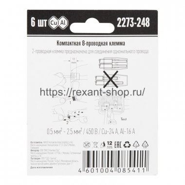 Купить по низким ценам Rexant 07-5145-06 Описание Rexant 07-5145-06 Электромонтажные экспресс-клемы WAGO 2273-248 позволят безопасно и быстро соединить 8 проводов между собой (алюминиевые и медные как одножильные, так и многожильные). Достаточно просто вставить жилу кабеля или провода в клемму и самозажимной контакт надежно зафиксирует соединение. Диаметр соединяемых проводов должен составлять в сечении от 0,5 до 2,5 мм2. Номинальный ток 24А; Номинальное напряжение 450В. Удобные тестовые гнезда, прозрачный корпус для визуального контроля и смотровое окно для проверки защиты от касаний делают работу более безопасной. Наличие пасты обеспечивает надёжную изоляцию контакта