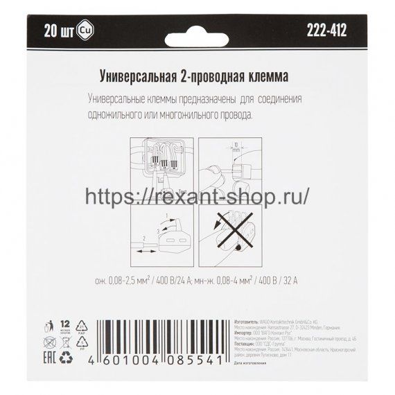 Универсальная клемма 2-х проводная, 20 штук (серия 222-412)