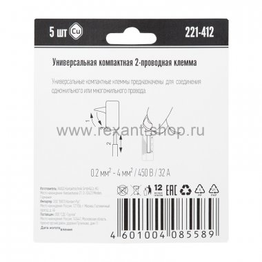 Универсальная 2-х проводная клемма, 5 штук (серия 221-412)