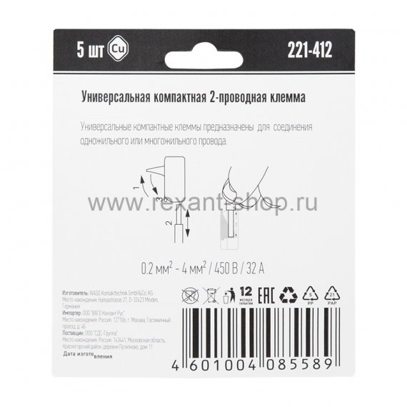 Купить по низким ценам Rexant 07-5161-05 Описание Rexant 07-5161-05 Оригинальная соединительнаяна многоразовая клемма WAGO (221-412) на 2 проводника с плоско-пружинным зажимом предназначена для подсоединения до 2 зачищенных проводников тонкого сечения ( от 0,08 мм² до 4 мм², одно- и многожильных до 2,5 мм²).Номинальный ток 32А; Номинальное напряжение 450В.