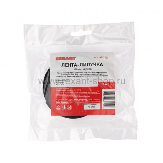 Лента-липучка многоразовая 5 м х 20 мм, черная (1 шт.) REXANT