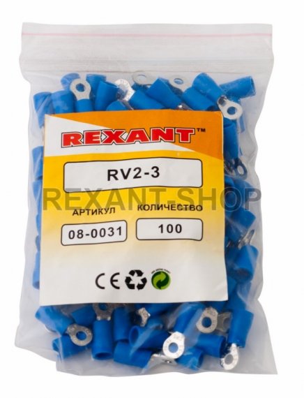 НАКОНЕЧНИК КОЛЬЦЕВОЙ изолированный (НКИ ø3.2мм) 1.5-2.5мм² (RV2-3, VR2-3) REXANT предназначен для создания качественного подключения электрооборудования, которое осуществляется через контактное соединение на основе винтовой фиксации. Такая клемма используется для оконцовывания многожильных медных проводов при монтаже мобильных электрических контактных соединений на подвижном составе (автомобиле-, вагоно-, самолето- и судостроении) или в других местах, где важна надежность соединения (к примеру, телефонное или климатическое оборудование). Изолированный кольцевой наконечник REXANT состоит из двух компонентов: металлического коннектора и защитного изолятора. Металлический коннектор изготовлен из латуни, с поверхностным электролитическим лужением, а изолятор клеммы из поливинилхлорида (ПВХ), который надежно защищает место обжима кабеля. Обжатие производится специальными пресс-клещами (HT-301 H арт.12-3014, 12-3014; HT-301 N арт.12-3116, 12-3117, 12-3016, 12-3016-4; HT-301 W арт.12-3021, 12-3021-4, 12-3121) поверх защитного изолятора. Цвет изолятора синий. Основные характеристики: