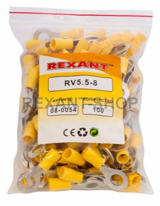 НАКОНЕЧНИК КОЛЬЦЕВОЙ изолированный (НКИ ø8.4мм) 4-6мм² (RV5.5-8, VR5.5-8) REXANT предназначен для создания качественного подключения электрооборудования, которое осуществляется через контактное соединение на основе винтовой фиксации. Такая клемма используется для оконцовывания многожильных медных проводов при монтаже мобильных электрических контактных соединений на подвижном составе (автомобиле-, вагоно-, самолето- и судостроении) или в других местах, где важна надежность соединения (к примеру, телефонное или климатическое оборудование). Изолированный кольцевой наконечник REXANT состоит из двух компонентов: металлического коннектора и защитного изолятора. Металлический коннектор изготовлен из латуни, с поверхностным электролитическим лужением, а изолятор клеммы из поливинилхлорида (ПВХ), который надежно защищает место обжима кабеля. Обжатие производится специальными пресс-клещами (HT-301 H арт.12-3014, 12-3014; HT-301 N арт.12-3117, 12-3016, 12-3016-4; HT-301 W арт.12-3021, 12-3021-4, 12-3121) поверх защитного изолятора. Цвет изолятора желтый. Основные характеристики: