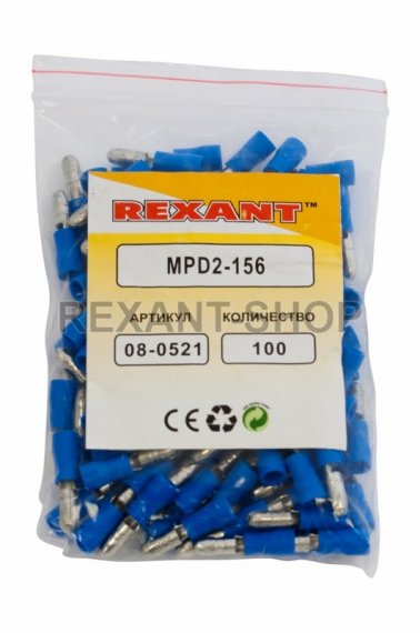 КЛЕММА ШТЕКЕРНАЯ изолированная (штекер ø4мм) 1.5-2.5мм² (MPD2-156, VM2-156) синий REXANT предназначена для создания качественного «мобильного» подключения электрооборудования или соединения проводов между собой, которое при необходимости, возможно разъединить без лишних усилий. Такая клемма используется для оконцовывания многожильных медных проводов при монтаже мобильных электрических контактных соединений на подвижном составе (автомобиле-, вагоно-, самолето- и судостроении). Изолированная штекерная клемма REXANT состоит из двух компонентов: металлического коннектора (штекер) и защитного изолятора, закрывающего место обжима провода. Металлический коннектор изготовлен из латуни, с поверхностным электролитических лужением, а изолятор клеммы из поливинилхлорида (ПВХ), надежно защищающий место обжима кабеля от физических воздействий, а человека от поражения электрическим током. Обжатие производится специальными пресс-клещами (HT-301 H, HT-301 N, HT-301 W) поверх защитного изолятора. Цвет изолятора синий. Технические характеристики: