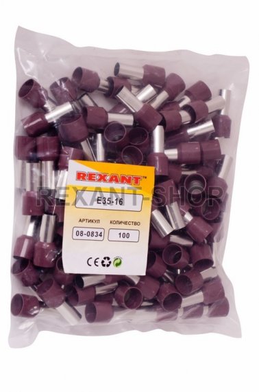 НАКОНЕЧНИК ШТЫРЕВОЙ ВТУЛОЧНЫЙ изолированный (НШВИ F-16мм) 35мм² (E35-16, СЕ350016red) красный REXANT предназначен для создания быстрого и качественного подключения различного электрооборудования и монтажа электросетей. Такой современный способ подготовки кабеля к соединению заменяет процесс облуживания или скрутки многожильных медных проводов, формируя целостностное окончание кабеля с последующим подключением промышленного или бытового электрооборудования. Втулочный наконечник состоит из латуни, с поверхностным электролитическим лужением, и рассчитан на монтаж одного проводника с соответствующим сечением под опрессовку. Предварительно зачищенная жила заводится внутрь, латунной втулки и обжимается специальными пресс-клещами (HT-301S арт.12-3119) в считанные секунды. Для удобства заведения многожильного провода внутрь латунной втулки предусмотрена манжета конической формы, изготовленная из поливинилхлорида (ПВХ), обеспечивающая надежную защиту соединения от влаги и других внешних воздействий. Технические характеристики: