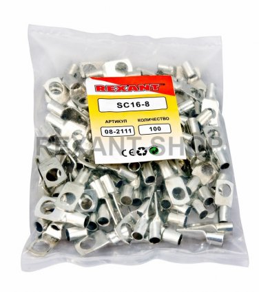 НАКОНЕЧНИК КОЛЬЦЕВОЙ (НК ø8.4мм) 16мм² (SC16-8) REXANT предназначен для создания качественного подключения электрооборудования, которое осуществляется через контактное соединение на основе винтовой фиксации. Такая клемма используется для оконцовывания многожильных медных проводов при монтаже электрооборудования силовых или осветительных сетей (электрооборудования промышленных предприятий, систем отопления, горячего водоснабжения, вентиляции и кондиционирования, обогрева водостоков и дренажа, лифтов или сверхмощного бытового электрооборудования). Кольцевой не изолированный наконечник REXANT изготовлен из латуни, с поверхностным электролитическим лужением, которое надежно защищает его от различных внешних воздействий. Использование такого наконечника для упрощения стыковки и монтажа кабеля обеспечит лучшую механическую прочность соединения на разрыв и максимально надежный контакт с кабельной жилой. Обжатие производится специальными пресс-клещами (рекомендуем - HT-25L арт. 12-3051; HT-2515 арт.12-3055; HT-6010 арт.12-3041) после заведения предварительно подготовленной жилы в трубную часть наконечника до упора. Основные характеристики: