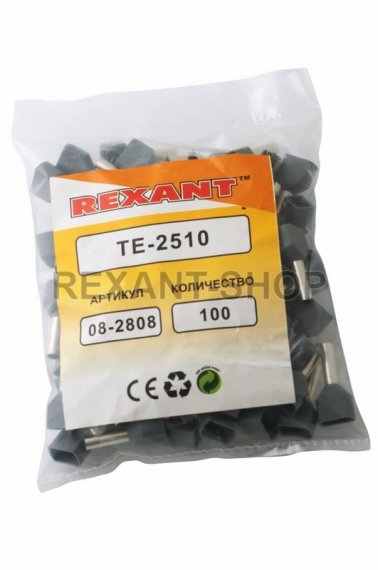 НАКОНЕЧНИК ШТЫРЕВОЙ ВТУЛОЧНЫЙ изолированный (НШВИ F-10мм) 2х2.5мм² (TE-2510) серый REXANT предназначен для создания быстрого и качественного подключения различного электрооборудования и монтажа электросетей. Такой современный способ подготовки кабеля к соединению заменяет процесс облуживания или скрутки многожильных медных проводов, формируя целостностное окончание кабеля с последующим подключением промышленного или бытового электрооборудования. Втулочный наконечник состоит из латуни, с поверхностным электролитическим лужением, и рассчитан на монтаж 2-х проводников с соответствующим сечением под опрессовку. Предварительно зачищенные жилы заводятся внутрь латунной втулки, и обжимается специальными пресс-клещами (HT-864 арт.12-3202, 12-3202-4; HT-866 арт.12-3205; HT-8164 арт.12-3206; HT8 6-4 арт.12-3106; HT-301E арт.12-3113, 12-3114, 12-3013) в считанные секунды. Для удобства заведения многожильных проводов внутрь латунной втулки предусмотрена манжета конической формы, изготовленная из поливинилхлорида (ПВХ), обеспечивающая надежную защиту соединения от влаги и других внешних воздействий. Технические характеристики: