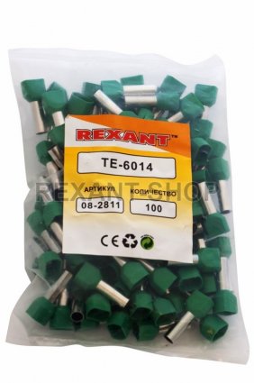 НАКОНЕЧНИК ШТЫРЕВОЙ ВТУЛОЧНЫЙ изолированный (НШВИ F-14мм) 2х6мм² (TE-6014) зеленый REXANT предназначен для создания быстрого и качественного подключения различного электрооборудования и монтажа электросетей. Такой современный способ подготовки кабеля к соединению заменяет процесс облуживания или скрутки многожильных медных проводов, формируя целостностное окончание кабеля с последующим подключением промышленного или бытового электрооборудования. Втулочный наконечник состоит из латуни, с поверхностным электролитическим лужением, и рассчитан на монтаж 2-х проводников с соответствующим сечением под опрессовку. Предварительно зачищенные жилы заводятся внутрь латунной втулки, и обжимается специальными пресс-клещами (HT-8164 арт.12-3206; HT-301S арт.12-3119, 12-3019, 12-3019-4) в считанные секунды. Для удобства заведения многожильных проводов внутрь латунной втулки предусмотрена манжета конической формы, изготовленная из поливинилхлорида (ПВХ), обеспечивающая надежную защиту соединения от влаги и других внешних воздействий. Технические характеристики: