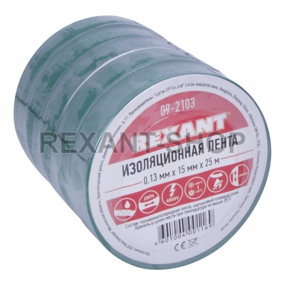 Зеленая изолента 15х25 REXANT – это поливинилхлоридная пленка, на одну сторону которой нанесен клеевой слой. Пленка разрезана на полосы по 15 мм. В одной упаковке пять рулонов длиной по 25 метров. Вещества, входящие в состав изоленты и клеевого слоя, не поддерживают горение. Изоляционная лента устойчива к перепадам температур в рамках от 0°С до +70°С.