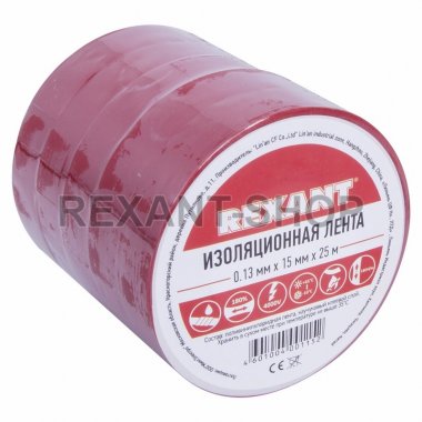 Изолента 15мм х 25м красная REXANT – это поливинилхлоридная пленка, на одну сторону которой нанесен клеевой слой. Пленка разрезана на полосы по 15 мм. В одной упаковке пять рулонов длиной по 25 метров. Вещества, входящие в состав изоленты и клеевого слоя, не поддерживают горение. Изоляционная лента устойчива к перепадам температур в рамках от 0°С до +70°С.