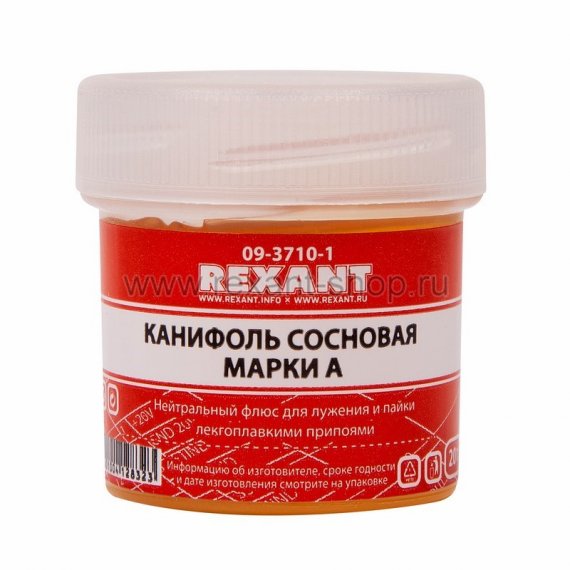 Канифоль сосновая марки А REXANT предназначена для удаления тонких и нестойких оксидов с поверхности под пайку, улучшения растекания жидкого припоя при пайке печатных плат и радиокомпонентов.