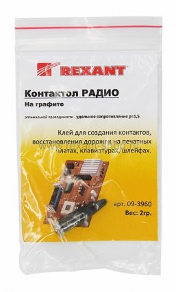 Клей электропроводный "Контактол Радио" 2гр REXANT применяется для восстановления поврежденных дорожек, а также для обеспечения высокой электропроводности и прочности восстановленного участка на диэлектрических панелях. Контактол обладает низкой гигроскопичностью. С помощью такого клея, возможно отремонтировать до 12 см поврежденных нитей. В качестве связующего вещества используются различные синтетические смолы, а токопроводящим наполнителем является графит.