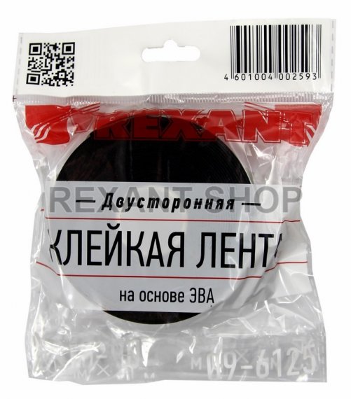 Двусторонние клейкие ленты Rexant на основе ЭВА (вспененный полиэтилен черного цвета) благодаря вспененной основе обладают высокими клеевыми свойствами способными склеивать различные по структуре поверхности, позволяя повторять форму рельефа поверхности, тем самым заполняя их неровности (дерево и пластик, стекло и ДСП), так же подходит для крепления молдингов, зеркал, пластиковых профилей. Имеют высокую устойчивость к сжатию, ультрафиолетовым лучам, маслам, пластификаторам, растворителям. Разработаны как для наружных, так и для внутренних работ. Оптимальная температура для работы с лентой 20-30 градусов и с относительной влажностью 50%. В условиях, когда к клейкой ленте прилагаются значительные (близкие к предельным) нагрузки следует иметь ввиду, что величина адгезии достигает максимума примерно через сутки после приклеивания.