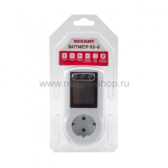 Счетчик потребляемой электроэнергии (ваттметр) REXANT RX-8 предназначен для измерения и контроля потребления энергии различными электроприборами, суммарный ток которых не превышает 16 А. RX-8 White оснащен возможностью установки цены киловатт-часа, что позволяет узнать суммарную стоимость потребленной электроэнергии.