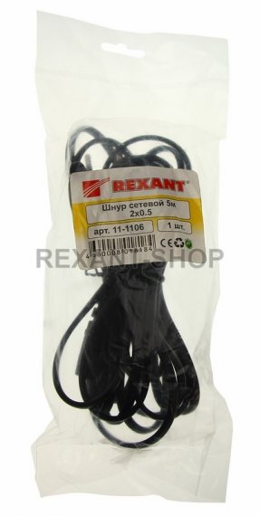 Шнур сетевой 5М 2х0.5мм² REXANT предназначен для подключения к сети переменного тока (AC) с напряжением 220B аудио-, видеоаппаратуры, источников питания ноутбуков, игровых консолей и других приборов, имеющих штыревой сетевой разъем типа С8 (известен из-за его формы как "восьмёрка"). Данный сетевой шнур (IEC cord) состоит из двухжильного провода с сечением жил 0.5мм², с одной стороны литой неразборной плоской вилкой (Евро) и с другой литым гнездовым неполяризованным разъёмом типа C7 (евро-разъём). Основные характеристики: