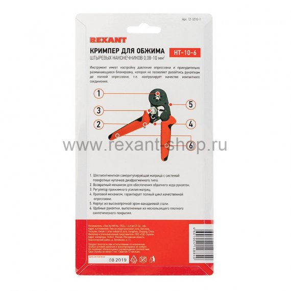 Кримпер REXANT HT 10-6 для обжима штыревых наконечников 0.08-10.0 мм? с регулятором прижимного усилия