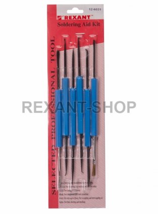 Набор для пайки из 6 предметов CT-3616 (ZD-151) REXANT предназначен для монтажных и ремонтных работ с радиоэлементами на платах, в корпусах аппаратуры, в часовых механизмах и т.п. Используется в электронике, моделировании и ювелирном деле. Ручки из качественной пластмассы не растворяются в отмывочных жидкостях. В набор для паяния входит: Прижим - служит для удержания или прижимания различных элементов (резисторов, конденсаторов, микросхем и т.п.); Вилка - служит для удаления радиоэлементов с платы, вывод выдергивается при нагреве его паяльником. Другим концом можно закручивать кольца, захватывать пазом конец вывода; Крючок - предназначен для укладки тонких проводников и правильного расположения их на плате при монтаже; Шабер - нож предназначен для зачистки поверхностей от окислов и остатков припоя и флюса, а также для подрезки и зачистки проводов, дорожек на плате, удаления защитного покрытия; Шило - с одного конца цилиндрическое, с другого - 4-х гранное служит для прочистки и расширения отверстий в платах; Кисточка - для удаления остатков припоя, флюса, очистки поверхностей от окислов (бронзовая и из нержавеющей стали).