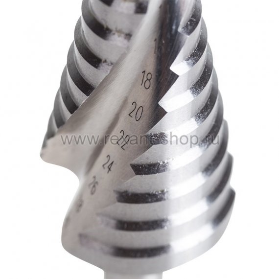 Ступенчатое сверло предназначено для получения отверстий различного диаметра без перестановки режущего инструмента. Применяется в работе с такими материалами как пластик, дерево, металл и др. Хвостовик прибора имеет форму конуса. На каждой ступени есть маркировка фактического диаметра. Сверло изготовлено из инструментальной легированной стали и покрыто нитридом титана.