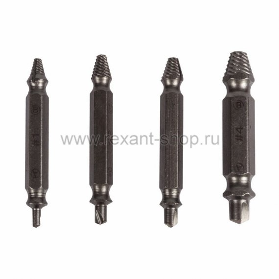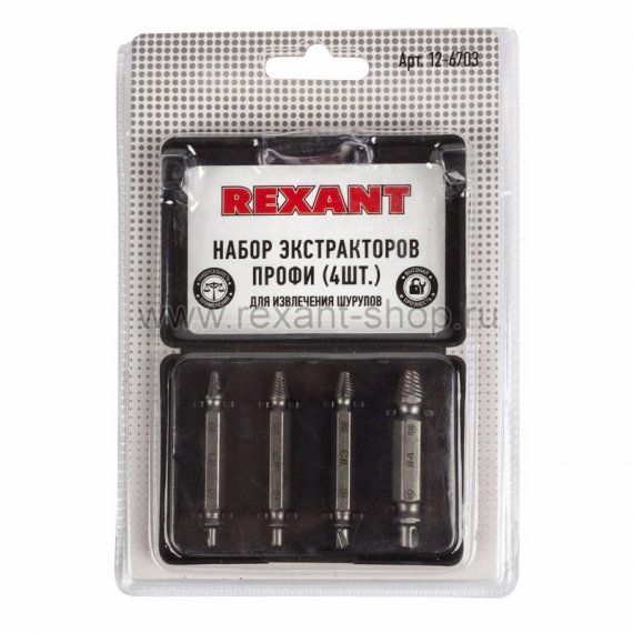 Купить по низким ценам Rexant 12-6703 Описание Rexant 12-6703 Набор экстракторов Профи REXANT предназначен для извлечения саморезов и винтов с поврежденными внутренними шлицами. Набор включает в себя четыре двухсторонние! биты различных размеров.