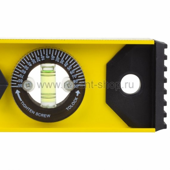 Уровень изготовлен из жесткого двутаврового алюминиевого профиля. Модель имеет три пузырьковых глазка для проверки отклонений по горизонтали, вертикали, а также один из глазков является поворотным и позволяет использовать уровень для выставления произвольных углов.