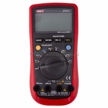 UT61C - это профессиональный TRUE RMS мультиметр с современным и эргономичным дизайном. Предназначен прибор, для измерений постоянного и переменного напряжения, сопротивления, постоянного и переменного тока. Кроме того он имеет функции измерения электрической емкости, температуры и частоты, а так же с его помощью вы сможете тестировать диоды и проводить прозвонку целостности цепи. Данный прибор обладает высоким классом точности показаний и измерением истинных среднеквадратических значений (TRUE RMS). Дисплей прибора оснащен подсветкой, которая позволяет проводить измерения даже в слабоосвещенных местах и имеет разрядность 6000. Широкий функционал мультиметра UT61C позволяет обходиться без других вспомогательных устройств. Прибор оснащен функцией Data hold, и зафиксировав результат измерений, вы в любое время сможете считать полученный значение. Прибор изготовлен из высококачественных материалов. Калибровка и тестирование приборов произведено под контролем компании REXANT INTERNATIONAL. Инженеры старались сделать прибор максимально удобным для использования, и сужение в нижней области корпуса позволяет удобнее располагать прибор в одной руке, а шероховатость корпуса предотвращает выскальзывание. Все переключения удобно производить даже одной рукой. Мультиметр имеет разъем для подключения к ПК что делает возможным проводить мониторинг и анализ полученных результатов. UT61C имеет функцию автоматического выбора пределов измерений. В отличие от устаревших моделей, где вам приходилось вручную выставлять пределы, сейчас же нужно всего лишь выбрать какой из параметров вы собираетесь измерять. Кроме того у прибора усиленный переключатель, благодаря которому исключается возможность случайного нажатия.