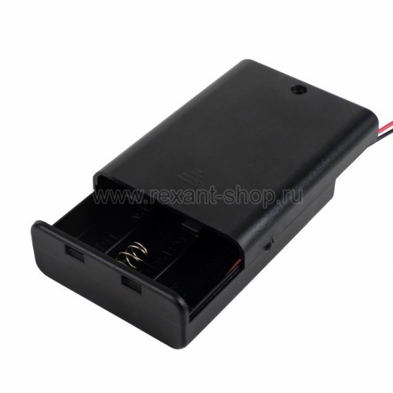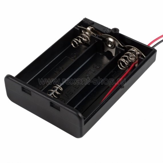 Батарейный отсек (держатель батареек) закрытого типа для трех батарей типоразмера АА с контактными проводами предназначен для подключения питания в различном оборудовании (в том числе, в бытовых устройствах, игрушках и радиоуправляемых моделях). В целях ускорения и удобства монтажа держатель выполнен с двумя проводами (красного и черного цвета) длиной по 13 см, т.е. не требует пайки контактов. Окончания проводов подготовлены для дальнейшего монтажа: зачищены и облужены оловом. Суммарное напряжение при использовании 3-х батареек на 1.5 В - составит 4,5 В.