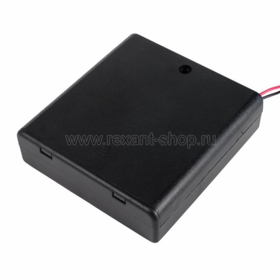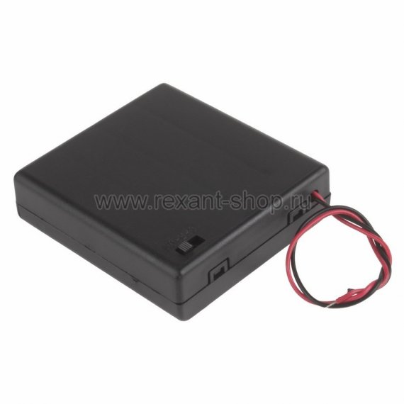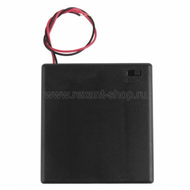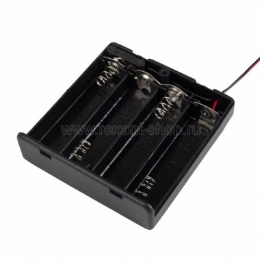 Батарейный отсек (держатель батареек) закрытого типа для четырех батарей типоразмера АА с контактными проводами предназначен для подключения питания в различном оборудовании (в том числе, в бытовых устройствах, игрушках и радиоуправляемых моделях). В целях ускорения и удобства монтажа держатель выполнен с двумя проводами (красного и черного цвета) длиной по 15 см, т.е. не требует пайки контактов. Окончания проводов подготовлены для дальнейшего монтажа: зачищены и облужены оловом. Суммарное напряжение при использовании 4-х батареек на 1.5 В -составит 6 В.