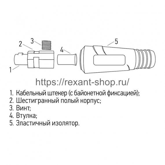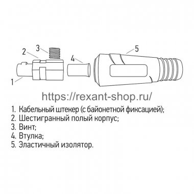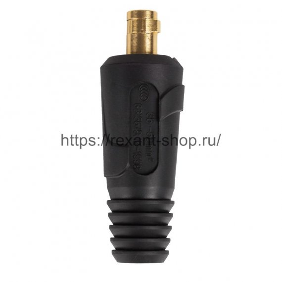 Вилка кабельная REXANT – быстросъемный соединительный разъем (штекер), который монтируется на кабель сварочных аксессуаров (держатель электрода на проводе или зажим массы) для последующего простого и надежного соединения к корпусу сварочного аппарата, при наличии на нем соответствующего разъема или с кабелем с целью общего увеличения длины кабеля.