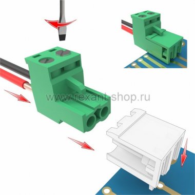 Перед монтажом с соединяемых проводников необходимо снять изоляцию. Зачищенный участок с монтажной стороны не должен иметь сильных изгибов. Вставьте его в свободное гнездо клеммы, после этого используя шлицевую отвертку поверните винт и зафиксируйте провод в зажимной камере. Убедитесь в верном положении проводника, именно при выполнении этого условия конструкция предотвращает случайное размыкание контакта. После этого клемму можно подключать к ответной части разъёма установленной на плате (арт.16-0912-9 штекер (2EDGR-02P)).