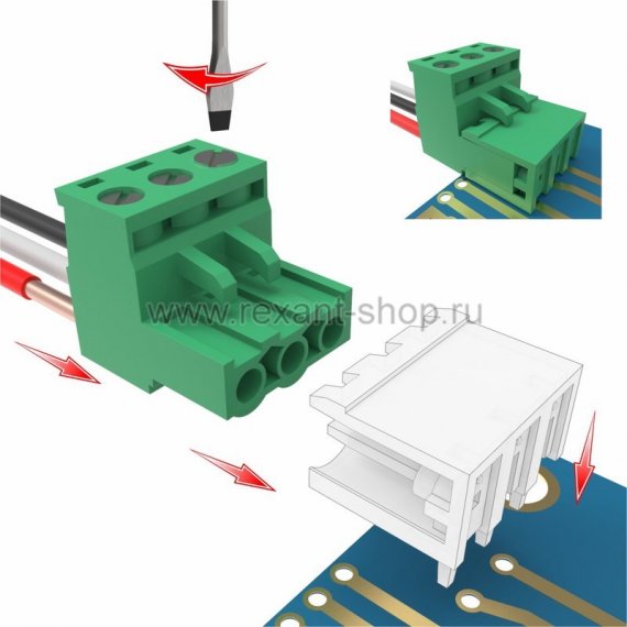 Перед монтажом с соединяемых проводников необходимо снять изоляцию. Зачищенный участок с монтажной стороны не должен иметь сильных изгибов. Вставьте его в свободное гнездо клеммы, после этого используя шлицевую отвертку поверните винт и зафиксируйте провод в зажимной камере. Убедитесь в верном положении проводника, именно при выполнении этого условия конструкция предотвращает случайное размыкание контакта. После этого клемму можно подключать к ответной части разъёма установленной на плате (арт.16-0913-9 штекер (2EDGR-03P)).