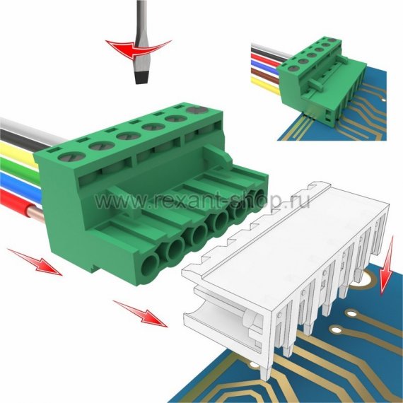 Перед монтажом с соединяемых проводников необходимо снять изоляцию. Зачищенный участок с монтажной стороны не должен иметь сильных изгибов. Вставьте его в свободное гнездо клеммы, после этого используя шлицевую отвертку поверните винт и зафиксируйте провод в зажимной камере. Убедитесь в верном положении проводника, именно при выполнении этого условия конструкция предотвращает случайное размыкание контакта. После этого клемму можно подключать к ответной части разъёма установленной на плате.