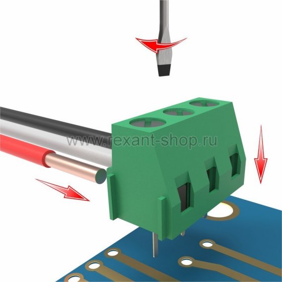 Соединительная 3-х контактная винтовая клемма (DG500-5.0-03P) предназначена для соединения печатной платы с проводником.