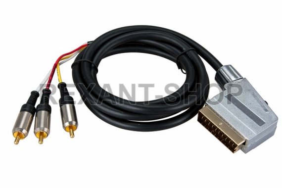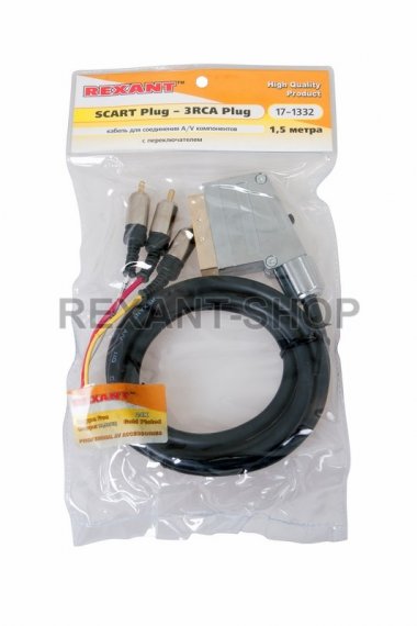 Шнур SCART Plug - 3RCA Plug с переключателем 1.5М (GOLD) металл REXANT предназначен для качественной двухсторонней передачи видео и аудиосигнала между устройствами (телевизор, видеомагнитофон, DVD-проигрыватель), имеющими разъемы типа SCART и RCA. Соединительный шнур с одной стороны имеет металлический (повышает помехозащищенность) штекер SCART-разъема (европейский стандарт для подключения мультимедийного оборудования) и с другой три зажимных металлических штекера RCA-разъема. Такие RCA разъемы повысят надежность соединения в несколько раз. Переключатель, расположенный на корпусе разъема SCART используется для смены in/out источников сигнала. В целях улучшения характеристик и снижения потерь передаваемого сигнала контакты разъемов имеют золотое напыление. Длина шнура составляет 1.5 метра. Профессиональный уровень надежности достигается благодаря применению качественных материалов и высокотехнологичного уровня исполнения шнура.