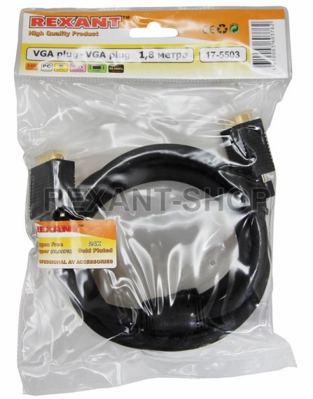 Шнур VGA plug - VGA plug 1.8М gold с ферритами REXANT предназначен для передачи аналогового видеосигнала. Используется для совместной работы устройств, имеющих разъемы VGA: компьютер, ноутбук, монитор, плазменный и ЖК телевизор, AV ресивер, проектор и т.п. С обеих сторон располагаются штекеры разъема VGA (англ. Video Graphics Array). Шнур имеет ферритовые фильтры, служащие в качестве дополнительной внешней защиты от электромагнитных волн, что гарантирует воспроизведение оригинального видеосигнала. Штекеры выполнены из качественного, легкого и прочного пластика. Длина шнура составляет 1.8 метра. Для безопасного хранения и бережной транспортировки предусмотрена PVC упаковка.
