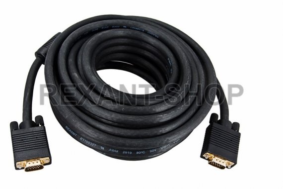 Шнур VGA plug - VGA plug 10М gold с ферритами REXANT предназначен для передачи аналогового видеосигнала. Используется для совместной работы устройств, имеющих разъемы VGA: компьютер, ноутбук, монитор, плазменный и ЖК телевизор, AV ресивер, проектор и т.п. С обеих сторон располагаются штекеры разъема VGA (англ. Video Graphics Array). Шнур имеет ферритовые фильтры, служащие в качестве дополнительной внешней защиты от электромагнитных волн, что гарантирует воспроизведение оригинального видеосигнала. Штекеры выполнены из качественного, легкого и прочного пластика. Длина шнура составляет 10 метров. Для безопасного хранения и бережной транспортировки предусмотрена PVC упаковка.