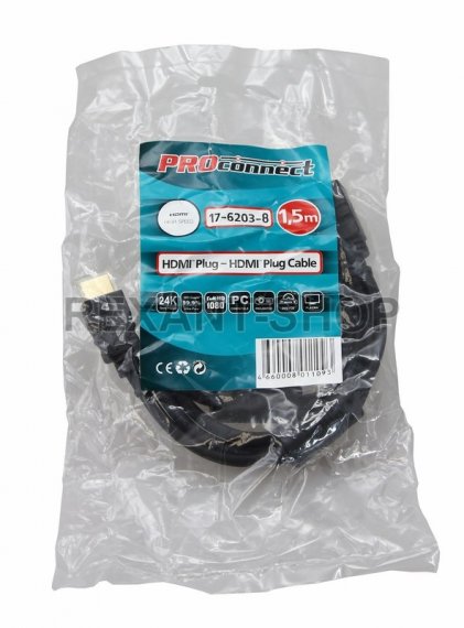 Шнур HDMI - HDMI gold 1.5М без фильтров (PE bag) PROCONNECT