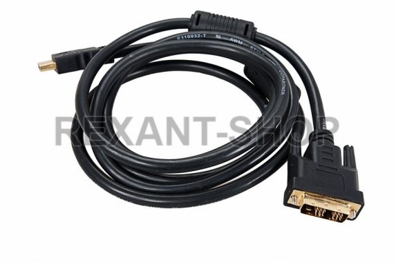 Шнур HDMI - DVI-D gold 2М с фильтрами REXANT предназначен для передачи цифрового видеоизображения высокого разрешения и многоканального аудио сигнала. Используется для совместной работы устройств, имеющих разъемы DVI-D и HDMI: проекторы, телевизионные аппараты, компьютеры и ноутбуки, мультимедийные проигрыватели и других видеоустройствах. С одной стороны располагается штекер разъема HDMI (High-Definition Multimedia Interface - интерфейс для мультимедиа высокой чёткости), а с другой штекер разъема DVI (Digital Visual Interface, сокр. DVI (англ. цифровой видеоинтерфейс)). Отличительной особенностью является наличие ферритовых фильтров, которые увеличивают индуктивность проходящего через него участка провода в несколько сотен раз, это обеспечивает подавление помех высокой частоты. Ферритовые кольца на шнуре используются как дополнительные внешние фильтры и обеспечивают воспроизведение абсолютно точного оригинального сигнала. Для производства жил используется только первичная, технически чистая медь (99%). На контакты разъемов нанесен слой золота по технологии вакуумного напыления, обеспечивающий повышение качественных показателей изображения и звука, а также отсутствие помех при передаче сигналов. Штекеры выполнены из легкого и прочного пластика. Длина шнура составляет 2 метра. Для бережной транспортировки и защиты от загрязнений предусмотрена PVC упаковка.