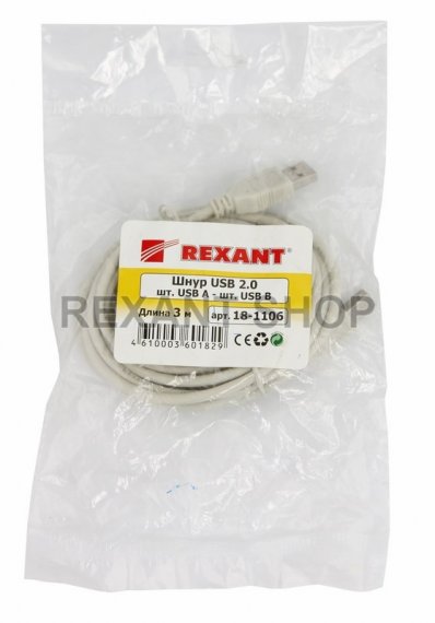 Купить по низким ценам Rexant 18-1106             Описание Rexant 18-1106 Шнур USB-А (male) - USB-B (male) 3M REXANT предназначен для подключения периферийных и портативных устройств (принтер, МФУ, сканер и т.п.) к компьютеру, имеющие разъемы типа USB-B. C одной стороны шнура располагается штекер разъема USB-A, а с другой штекер разъема USB-B. Разъемы изготовлены из высококачественного пластика, а контакты из никелированного сплава меди, что способствует стабильной передачи сигнала. Цвет шнура серый, а его длина составляет 3 метра. Интерфейс USB является самым распространенным на сегодняшний день.
