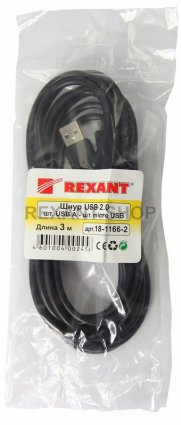 Шнур micro USB (male) - USB-A (male) 3M черный REXANT