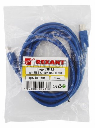 Шнур USB-A (male) - USB-B (male) 3M 3.0 REXANT предназначен для подключения периферийных и портативных устройств (джойстиков, различных манипуляторов аудио-, видеоустройств, устройства хранения информации, сканеры, принтеры, МФУ и т.п.) к компьютеру или другой технике, имеющей разъем USB типа B. C одной стороны шнура располагается штекер разъема USB-A, с другой стороны шнура располагается штекер разъем USB типа B. Разъемы изготовлены из высококачественного пластика, а контакты из никелированного сплава меди, что способствует стабильной передачи сигнала. Цвет шнура синий, а его длина составляет 3 метра. Интерфейс USB является самым распространенным на сегодняшний день, а разъемы USB 3.0 в отличие от USB 2.0 передает информацию в 10 раз быстрее ( 4,8 Гбит/с против 480 Мбит/с). Также в версии 3.0 увеличен номинальный допустимый ток с 500 до 900мА. Это позволяет подключать к одному хабу гораздо больше устройств, а так же избавляет от необходимости подключения отдельного блока питания.