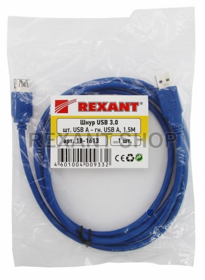 Шнур USB-A (male) - USB-A (female) 1.5M 3.0 REXANT предназначен для упрощения доступа к USB порту ПК и он может использоваться для удлинения USB-кабеля, который соединяет компьютер с периферийными и портативными устройствами (джойстиками, различными манипуляторами аудио-, видеоустройствами, устройства хранения информации, сканерами, принтерами, МФУ и т.п.). C одной стороны шнура располагается штекер разъема USB-A, с другой стороны шнура располагается разъем USB гнездо. Разъемы изготовлены из высококачественного пластика, а контакты из никелированного сплава меди, что способствует стабильной передачи сигнала. Цвет шнура синий, а его длина составляет 1.5 метров. Интерфейс USB является самым распространенным на сегодняшний день, а разъемы USB 3.0 в отличие от USB 2.0 передает информацию в 10 раз быстрее (4,8 Гбит/с против 480 Мбит/с). Также в версии 3.0 увеличен номинальный допустимый ток с 500 до 900мА. Это позволяет подключать к одному хабу гораздо больше устройств, а так же избавляет от необходимости подключения отдельного блока питания.