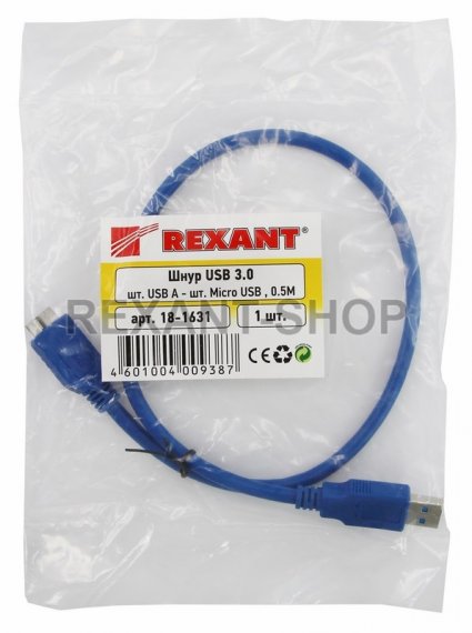 Шнур USB-A (male) – micro USB- (male) 0.5M 3.0 REXANT предназначен для подключения периферийных и портативных устройств (клавиатуры, мыши, джойстики, аудио-, видеоустройства, устройства хранения информации, сканеры и т.п.) к компьютеру или другой технике, имеющей разъем типа micro USB. C одной стороны шнура располагается штекер разъема USB-A, с другой стороны располагается разъем типа micro USB. Разъемы изготовлены из высококачественного пластика, а контакты из никелированного сплава меди, что способствует стабильной передачи сигнала. Цвет шнура синий, а его длина составляет 0.5 метра. Интерфейс USB является самым распространенным на сегодняшний день. Разъемы USB 3.0 в отличие от USB 2.0 передает информацию в 10 раз быстрее (4,8 Гбит/с против 480 Мбит/с). Также в версии 3.0 увеличен номинальный допустимый ток с 500 до 900мА. Это позволяет подключать к одному хабу гораздо больше устройств, а так же избавляет от необходимости подключения отдельного блока питания.