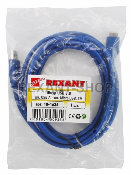 Шнур USB-A (male) – micro USB- (male) 3M 3.0 REXANT предназначен для подключения периферийных и портативных устройств (клавиатуры, мыши, джойстики, аудио-, видеоустройства, устройства хранения информации, сканеры и т.п.) к компьютеру или другой технике, имеющей разъем типа micro USB. C одной стороны шнура располагается штекер разъема USB-A, с другой стороны располагается разъем типа micro USB. Разъемы изготовлены из высококачественного пластика, а контакты из никелированного сплава меди, что способствует стабильной передачи сигнала. Цвет шнура синий, а его длина составляет 3 метра. Интерфейс USB является самым распространенным на сегодняшний день. Разъемы USB 3.0 в отличие от USB 2.0 передает информацию в 10 раз быстрее (4,8 Гбит/с против 480 Мбит/с). Также в версии 3.0 увеличен номинальный допустимый ток с 500 до 900мА. Это позволяет подключать к одному хабу гораздо больше устройств, а так же избавляет от необходимости подключения отдельного блока питания.