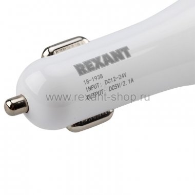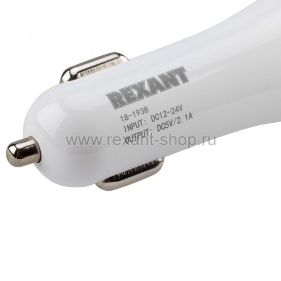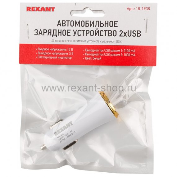 Автозарядка в прикуриватель 2хUSB с индикацией (АЗУ) (1000+2100 mA) белая REXANT