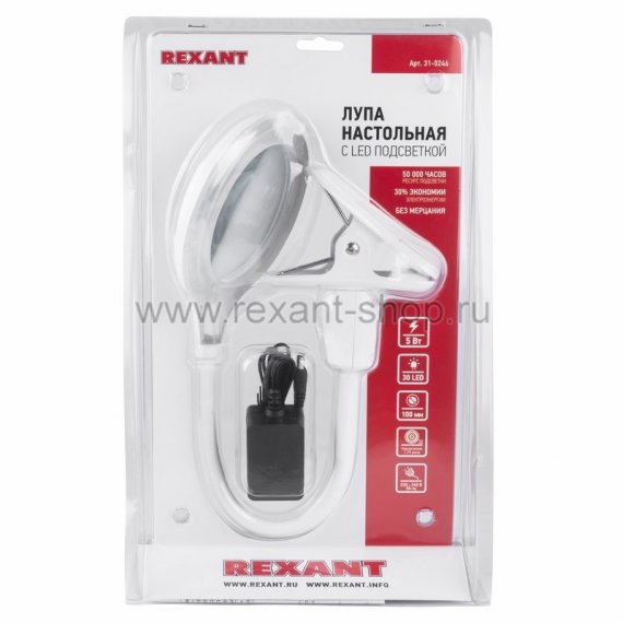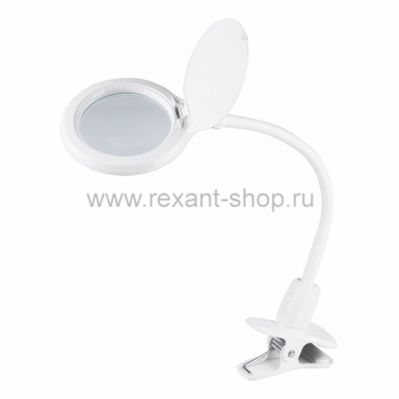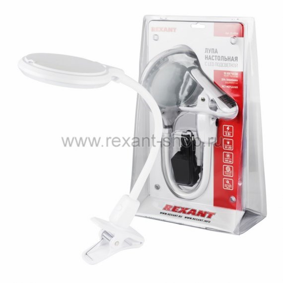 Лупа настольная малая 3X с подсветкой 30 SMD LED (прищепка), белая REXANT предназначена для визуального увеличения различных мелких предметов или их фрагментов.