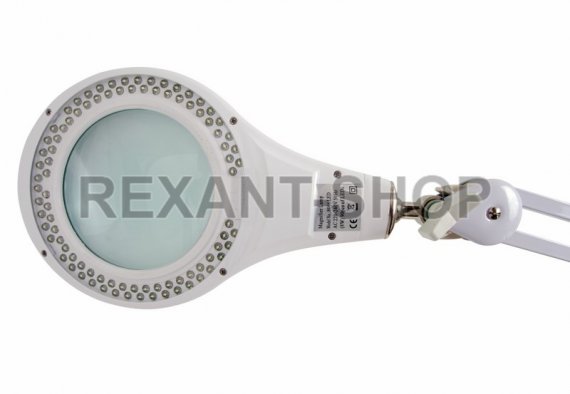 Лупа на струбцине круглая настольная 5Х с подсветкой 90 LED, белая REXANT предназначена для визуального увеличения различных мелких предметов или их фрагментов. Она используется в косметологии, при выполнении ювелирных и радиомонтажных работ, при ремонте часов, в биологии и медицине, для организации труда людей со слабым зрением, а также для других работ, где требуется дополнительное увеличение и подсветка рабочего поля. Такая оптическая система состоит из линзы, удобного пантографического механизма и бестеневой подсветки.