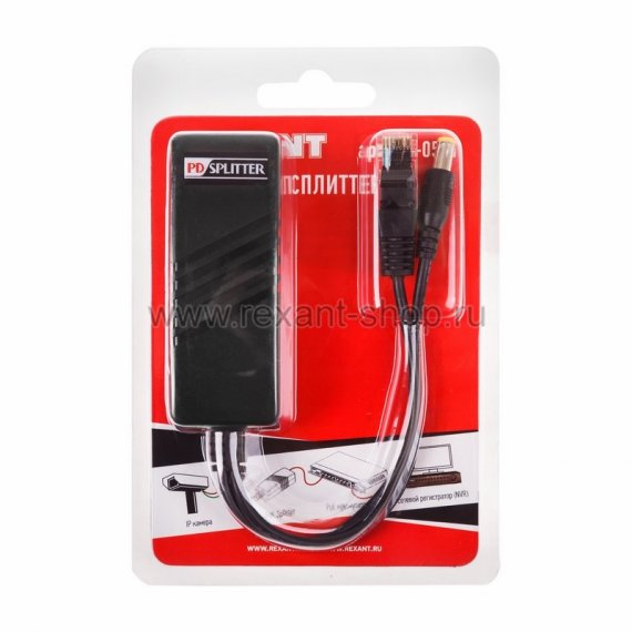 Сплиттер предназначен для разделения сигнала с витой пары RJ-45 (данные+питание), на отдельный канал данных RJ-45 и отдельный канал питания 5мм (12 В). Сплиттер позволяет запитать конечное устройство, не поддерживающее PoE.