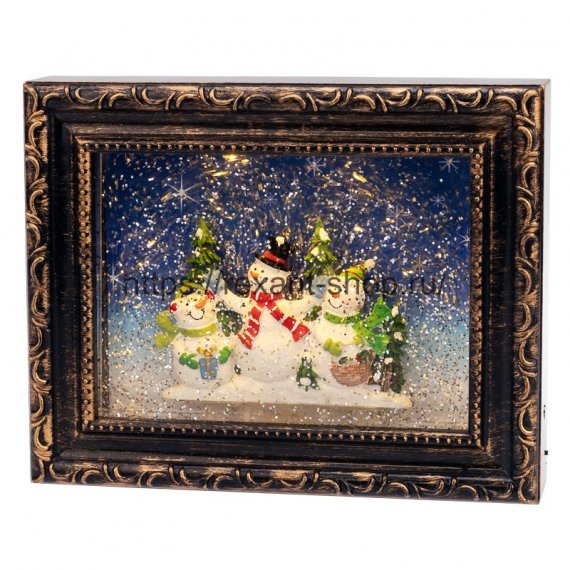 Декоративный светильник «Картина» с эффектом снегопада и подсветкой — прекрасный подарок к Новому году или Рождеству, который порадует и детей, и взрослых. Прозрачная колба наполнена жидкостью с металлизированным конфетти, которая начинает циркулировать сразу после включения. Сверкающий вихрь блесток уносит зрителей в волшебную зимнюю сказку, где главные герои — компания снеговиков — фигурки, стоящие в центре. Светильник работает от 3 элементов питания типа АА, что дает возможность использования в любом удобном месте. USB-шнур входит в комплект.